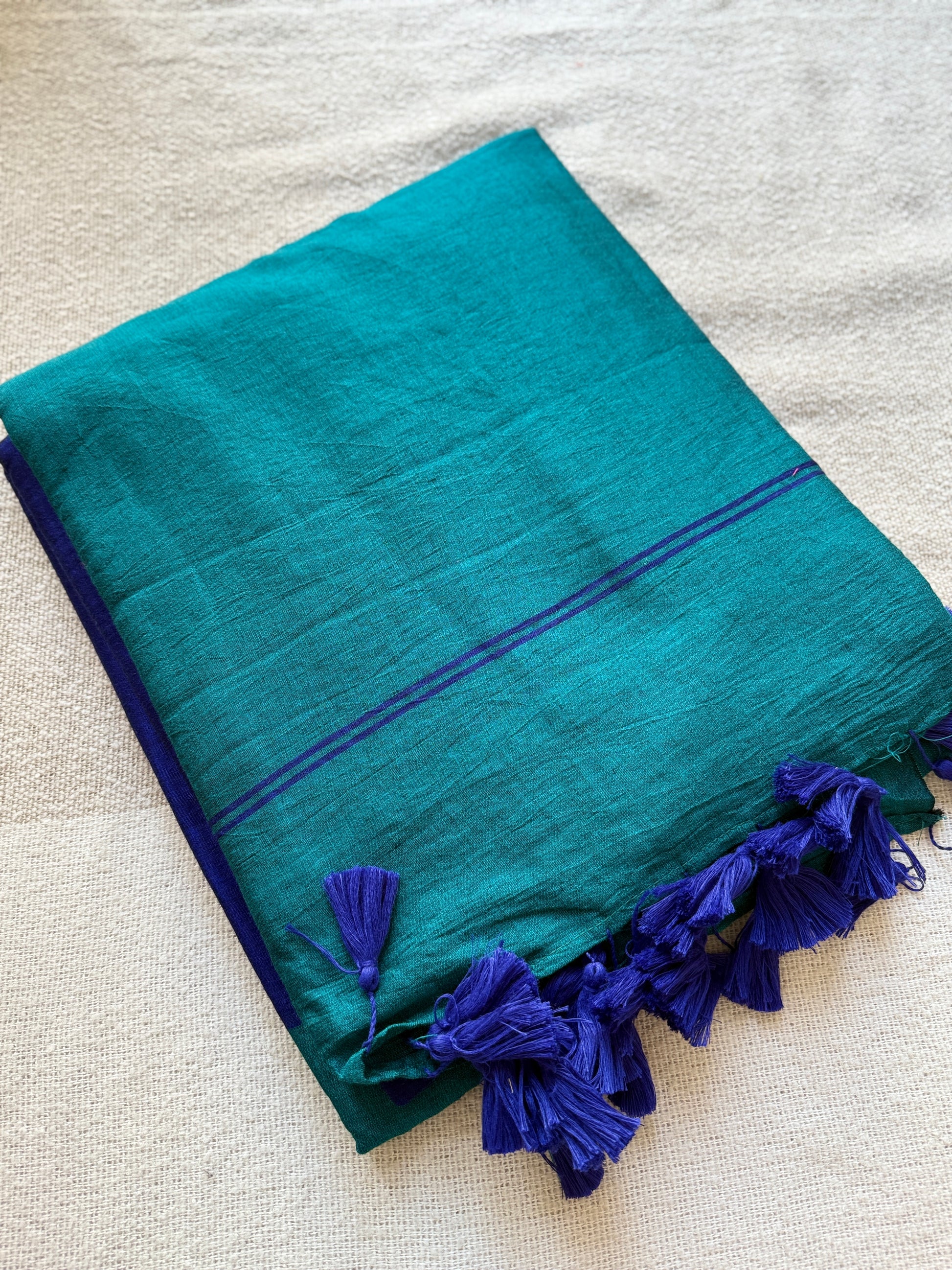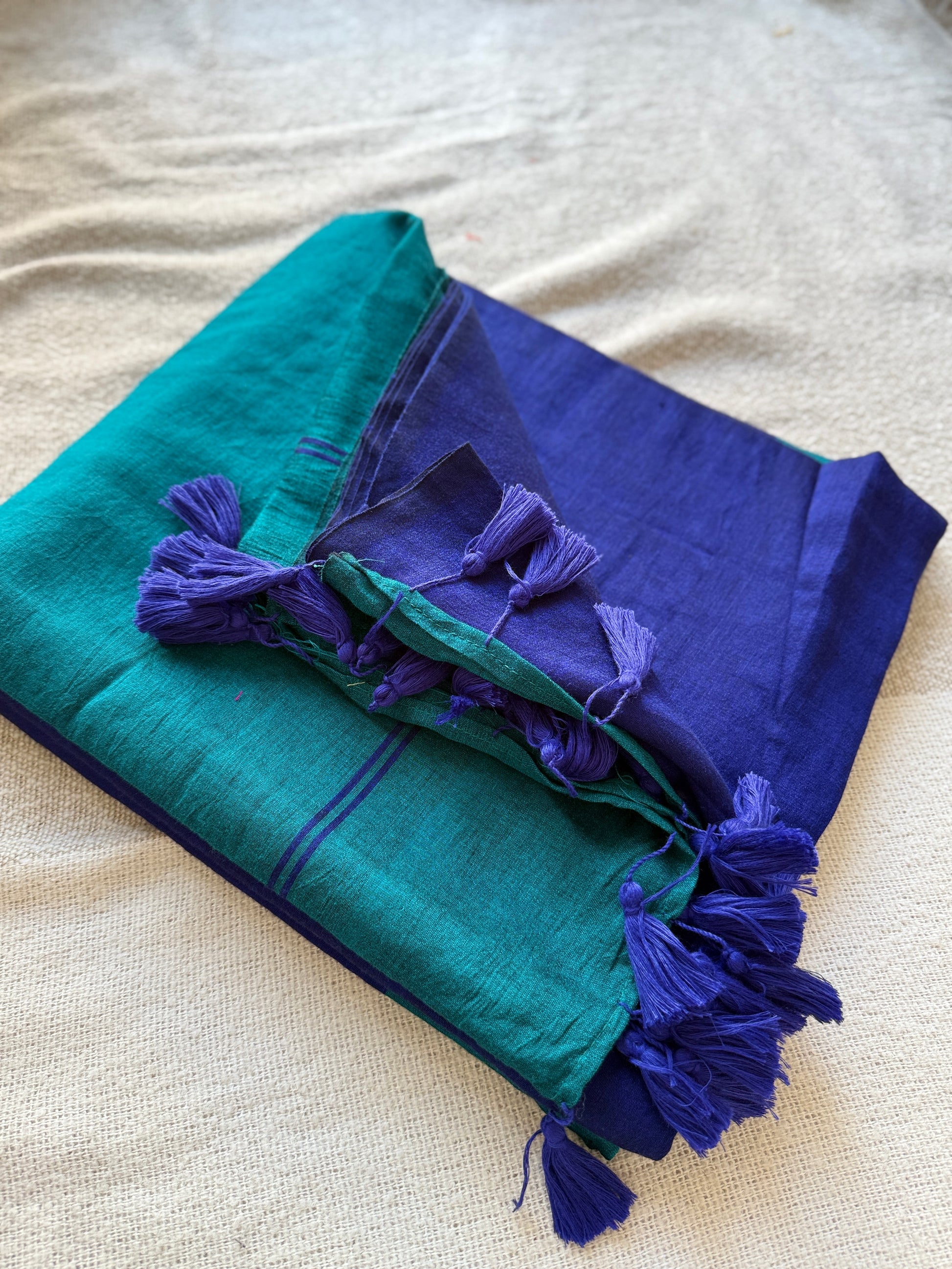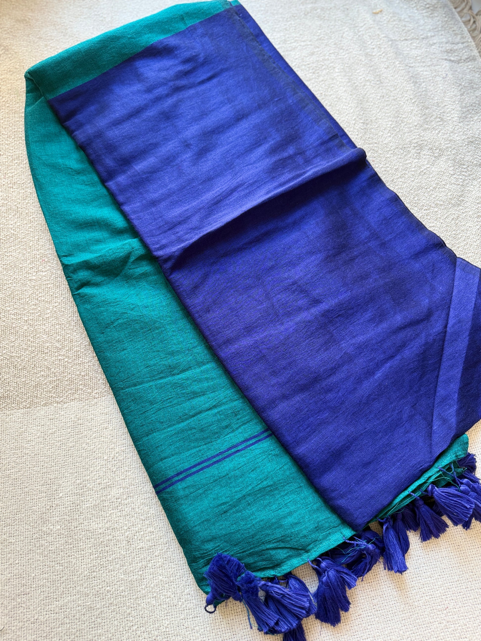 This dual-tone saree features a plain, minimal body paired with a beautifully contrasting pallu.