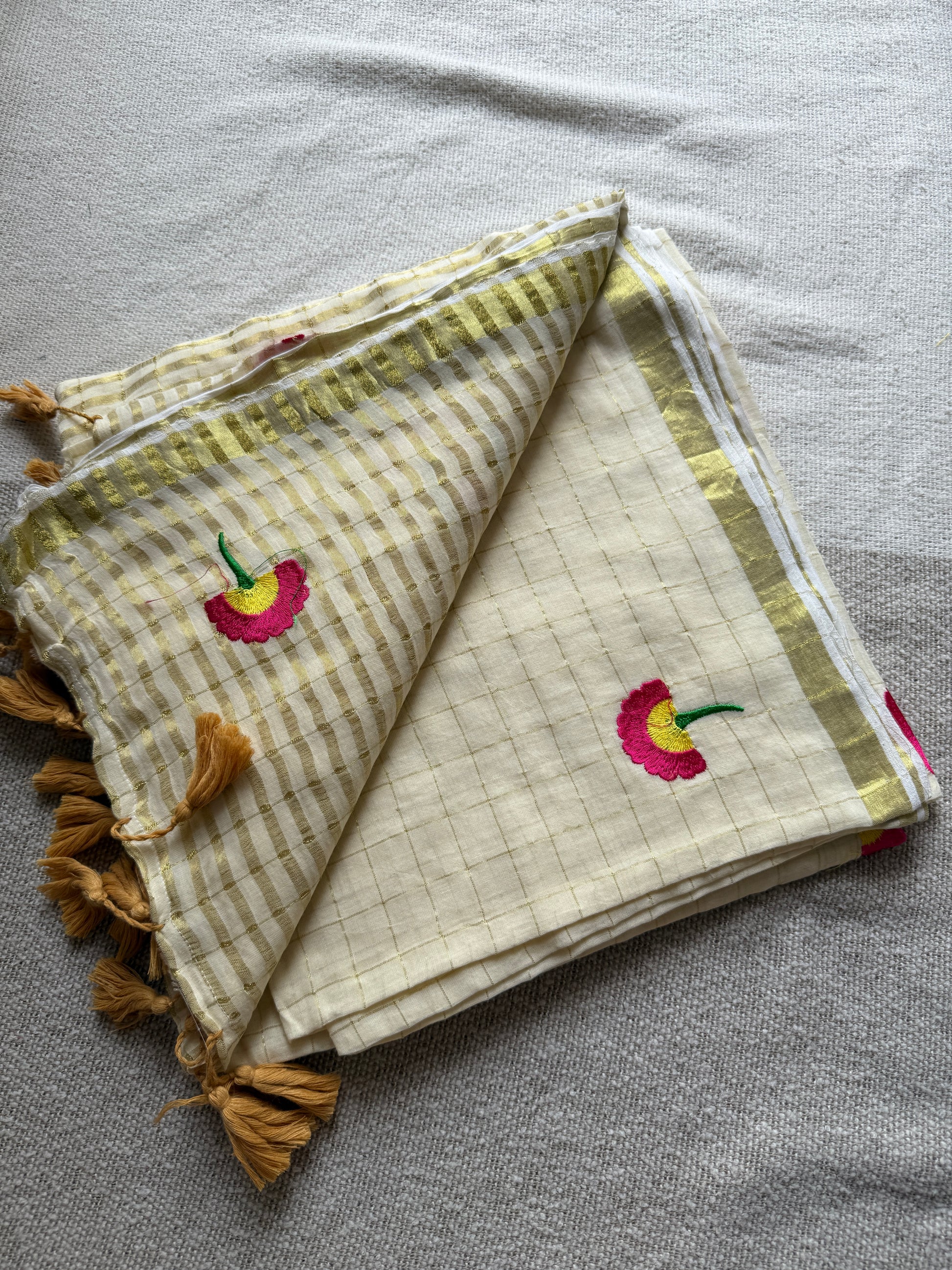 Flower Embroidered Golden Checkered Mul Cotton Saree