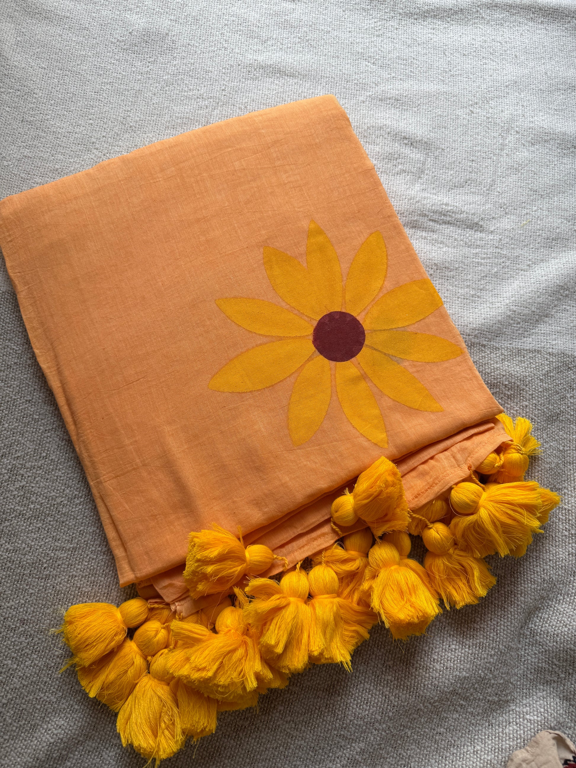 Handpainted Sunflower Peach / Orange Mul Cotton Saree
