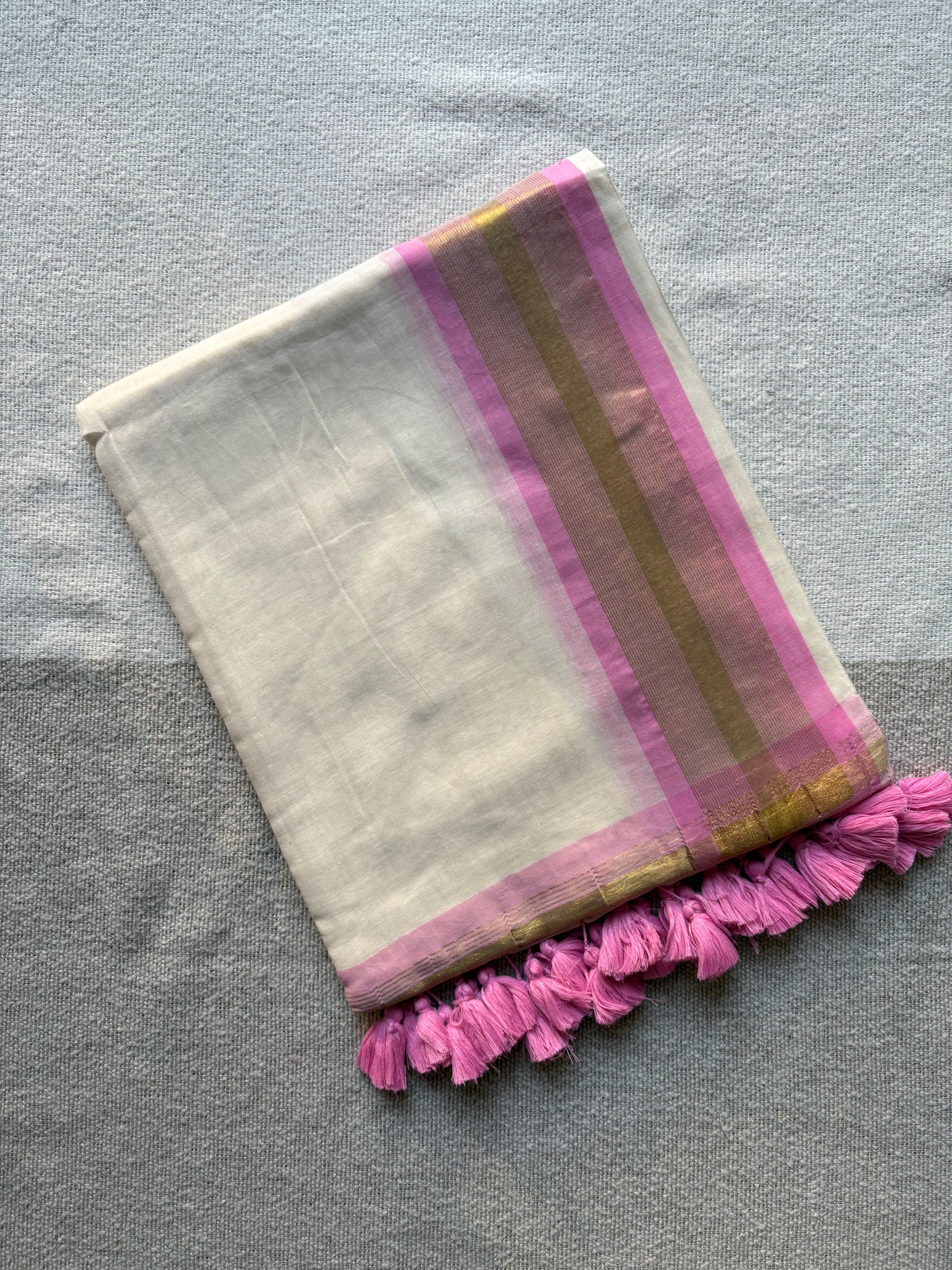 Pink and Off White Golden Zari Bordered Mul cotton Saree