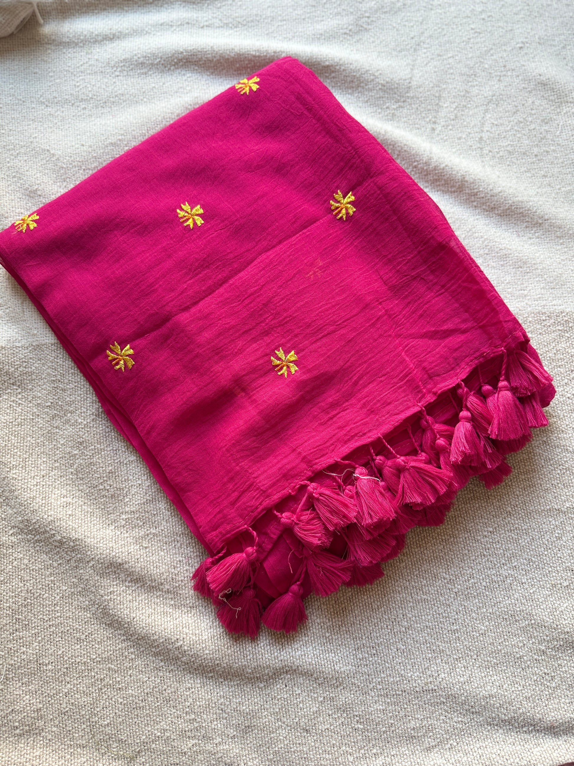 Pink Mul Cotton Contrast Parijaat Embroidered Saree