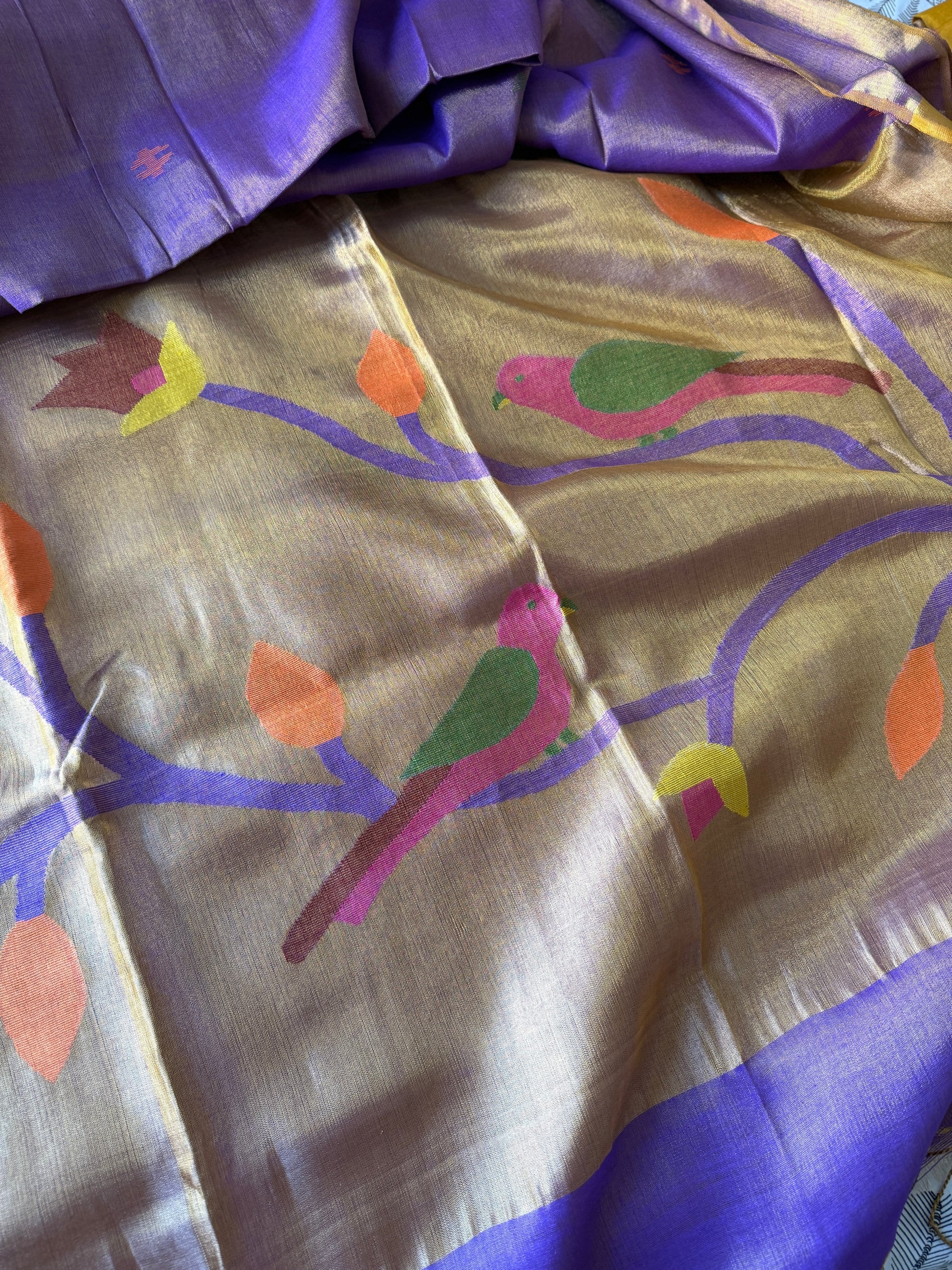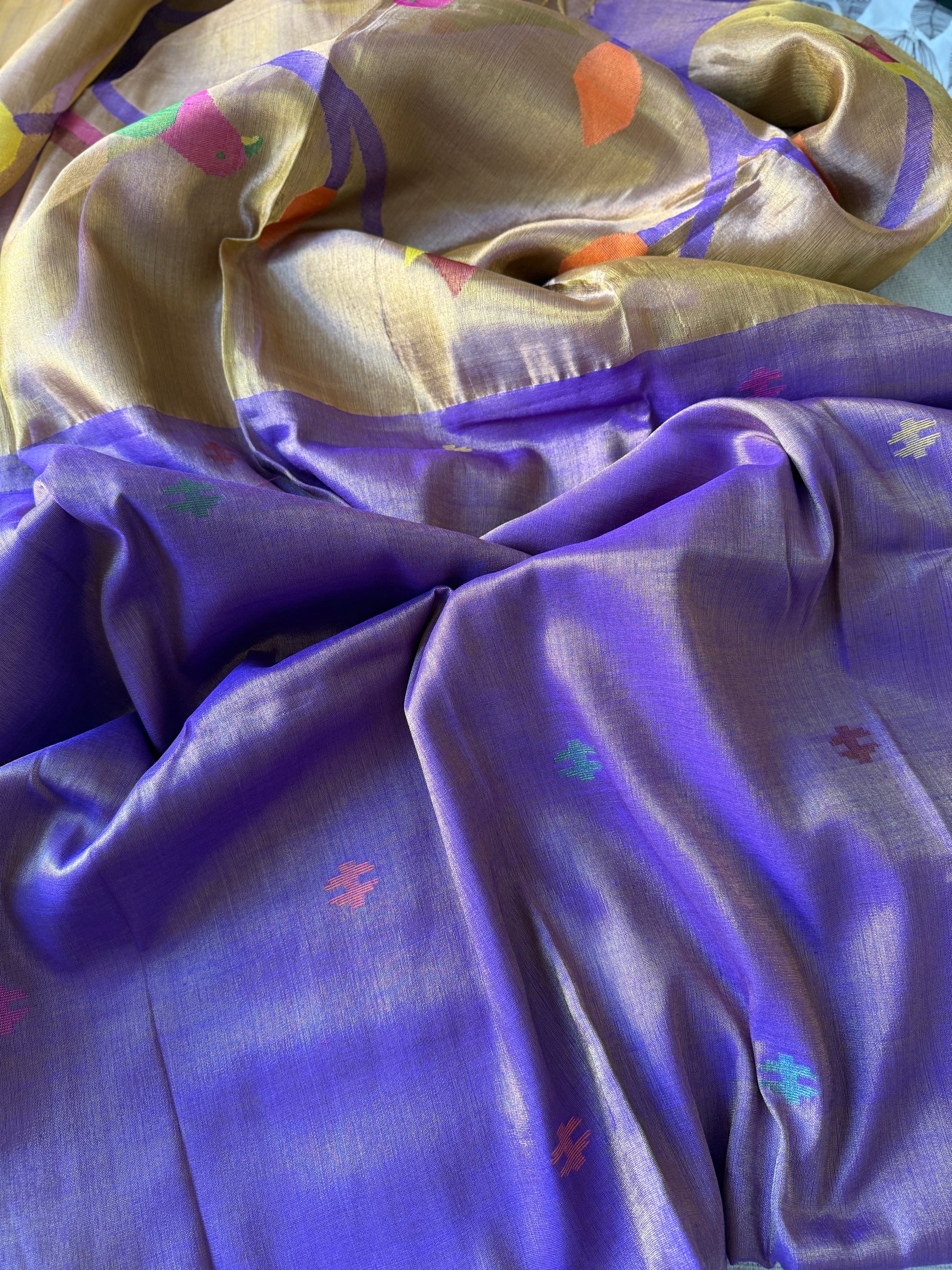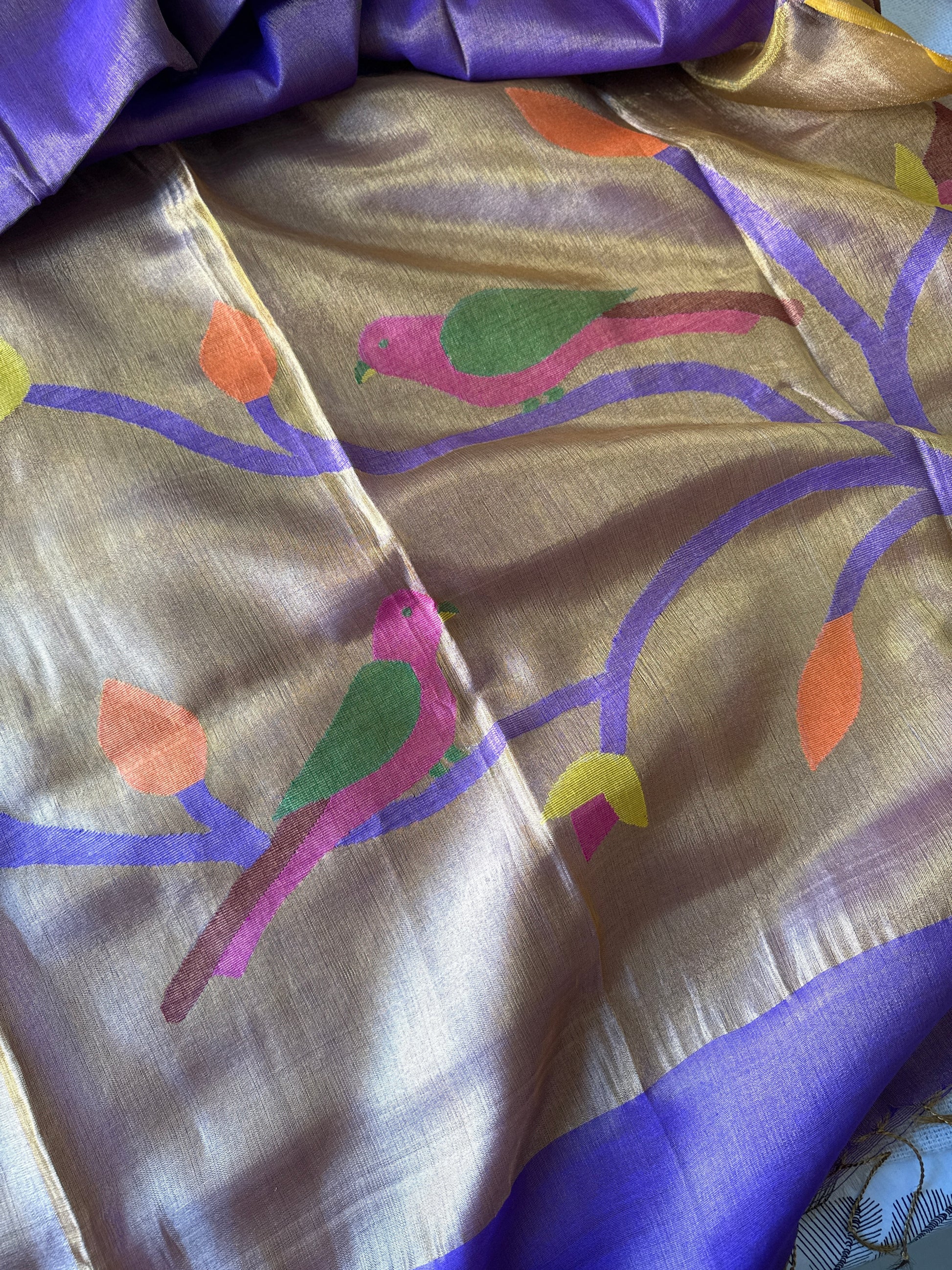 A dreamy soft tissue linen saree with a rich Paithani-style zari pallu, blending subtle shine with timeless tradition.