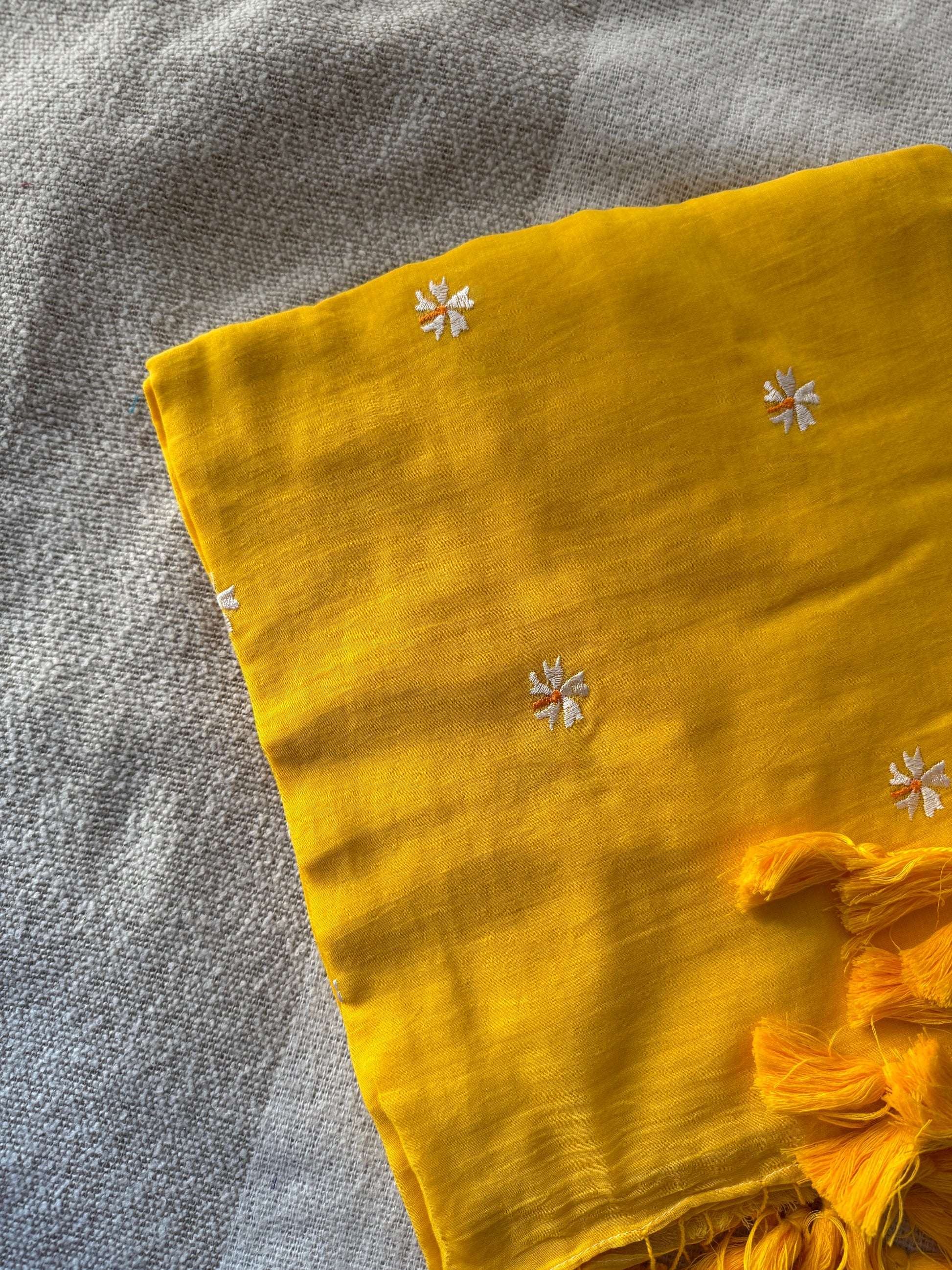 Yellow Parijaat Embroidered Mul Cotton Saree